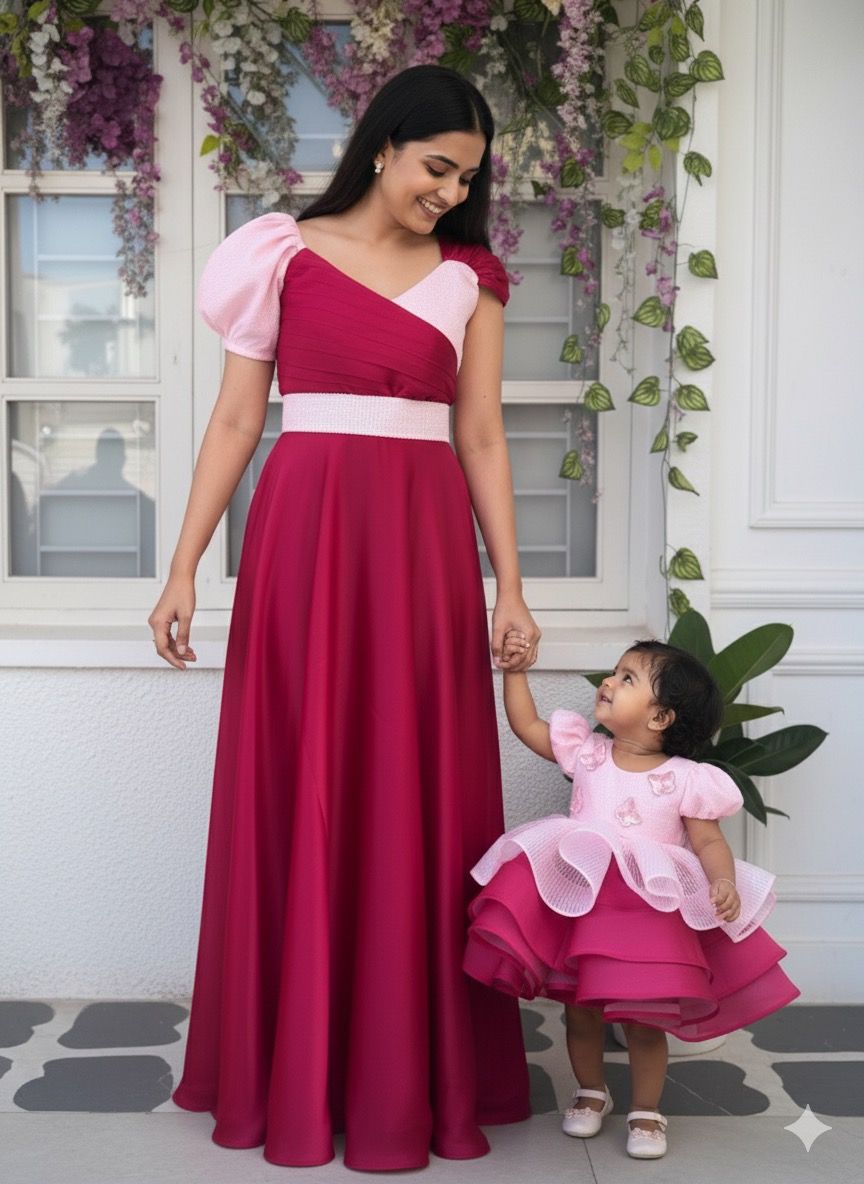 Celebrate special moments with the Mackenzie Duo, a sophisticated mother-daughter ensemble blending deep wine red and soft baby pink. The mother’s gown features an elegant floor-length design with a pleated criss-cross bodice and short puff sleeves, creating a defined waistline for a graceful silhouette. The daughter’s dress complements with playful layered ruffles, delicate embroidery, and a statement bow, crafted from shimmer net, organza, and satin-like fabrics that add volume and richness. Perfect for weddings, receptions, and photoshoots, this duo makes a striking, coordinated statement.