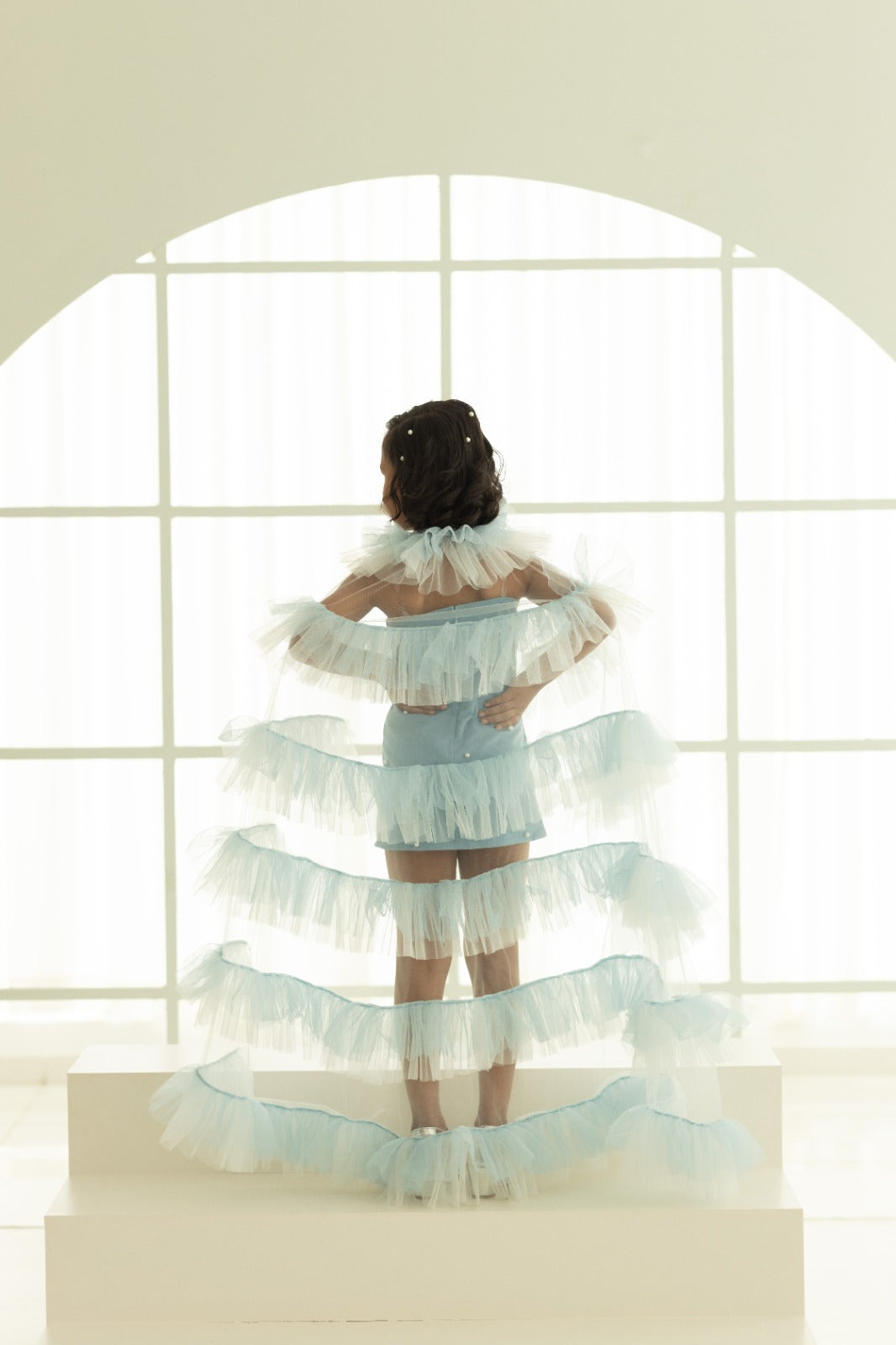 Twice the charm in one outfit! The 2-in-1 Detachable Cape Dress features a sleek base dress paired with a ruffled cape for a dramatic transformation. Ideal for birthdays or events where she wants to go from casual to couture in seconds. Made from soft net with intricate Pearl detailing for all-day comfort.