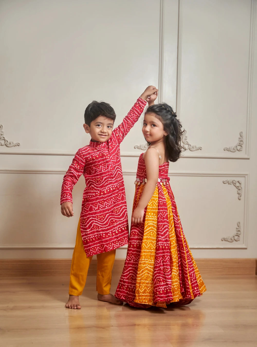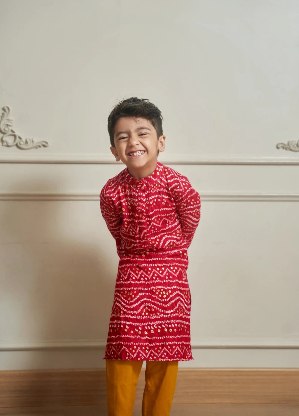 Boy’s Outfit: Bright red printed kurta with mustard yellow pants — a bold and cheerful combo.
