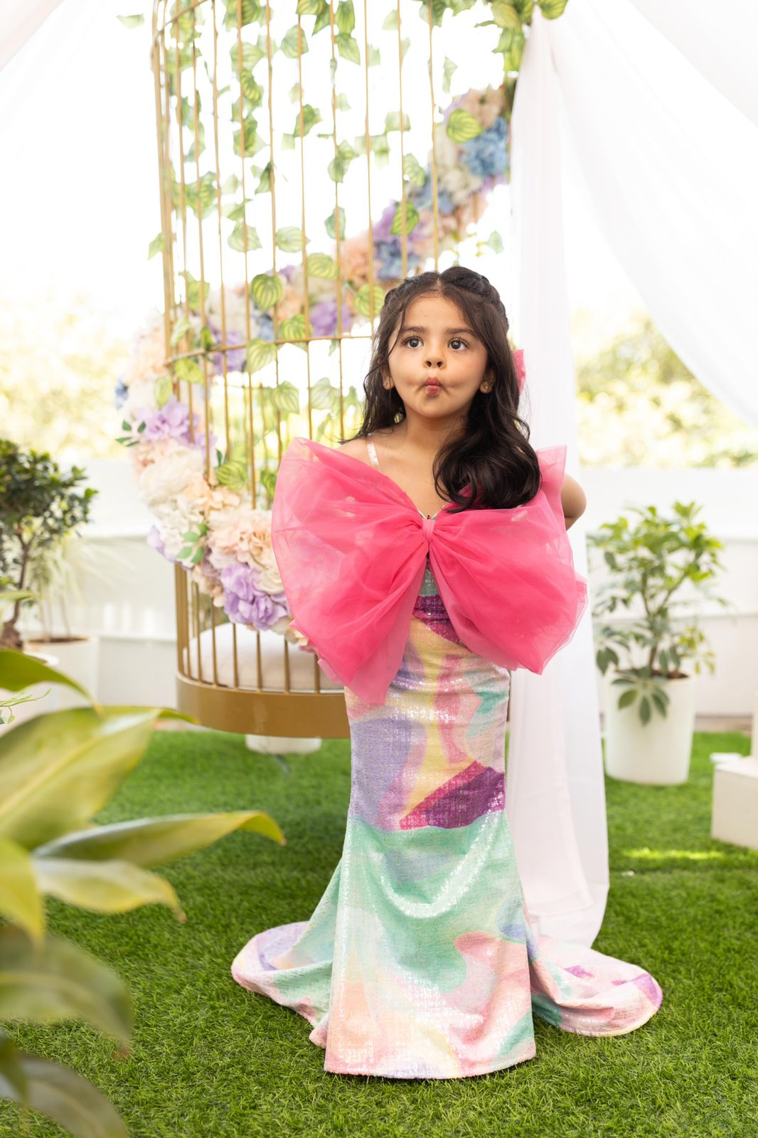 A stunning mermaid-style gown made with shimmering metallic fabric, featuring a sweetheart neckline and dramatic organza drape. The fitted silhouette adds a stylish flair, perfect for special occasions. (Current shade is out of stock but can be customized in other colors.)