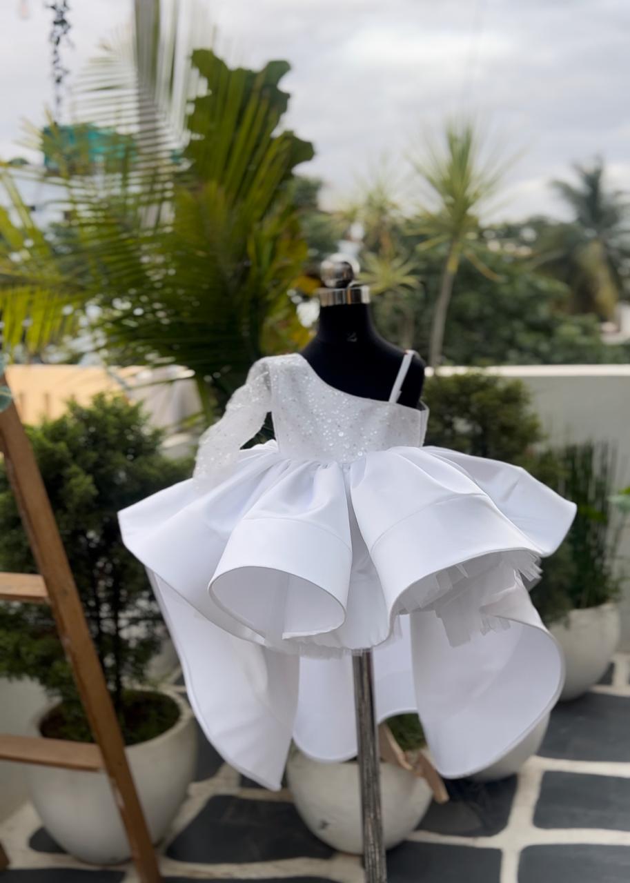 This elegant outfit features a one-shoulder design with a pearl and sequin-embellished bodice, creating a sophisticated and polished look. The high-low skirt adds a modern silhouette with graceful movement, perfect for a standout appearance at your special event. Combining classic detailing with contemporary style, this piece promises to elevate your bridal wardrobe.