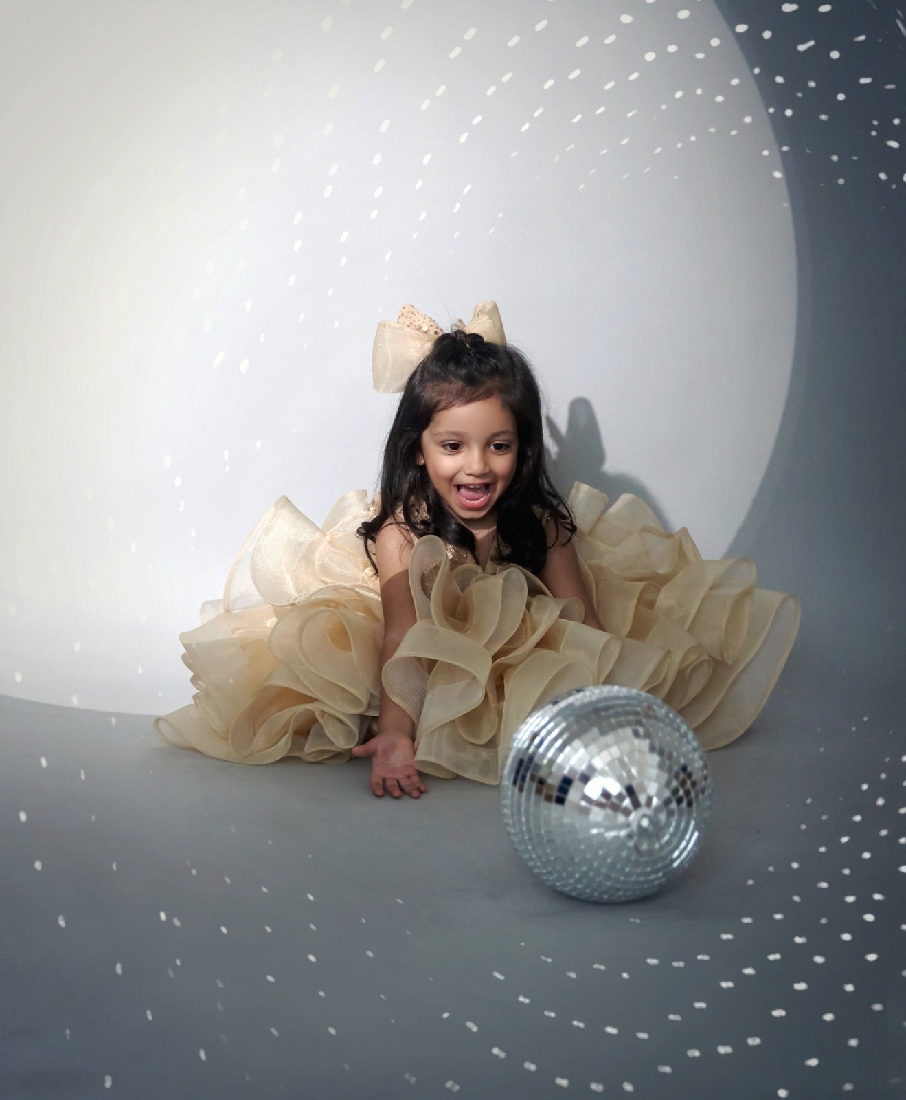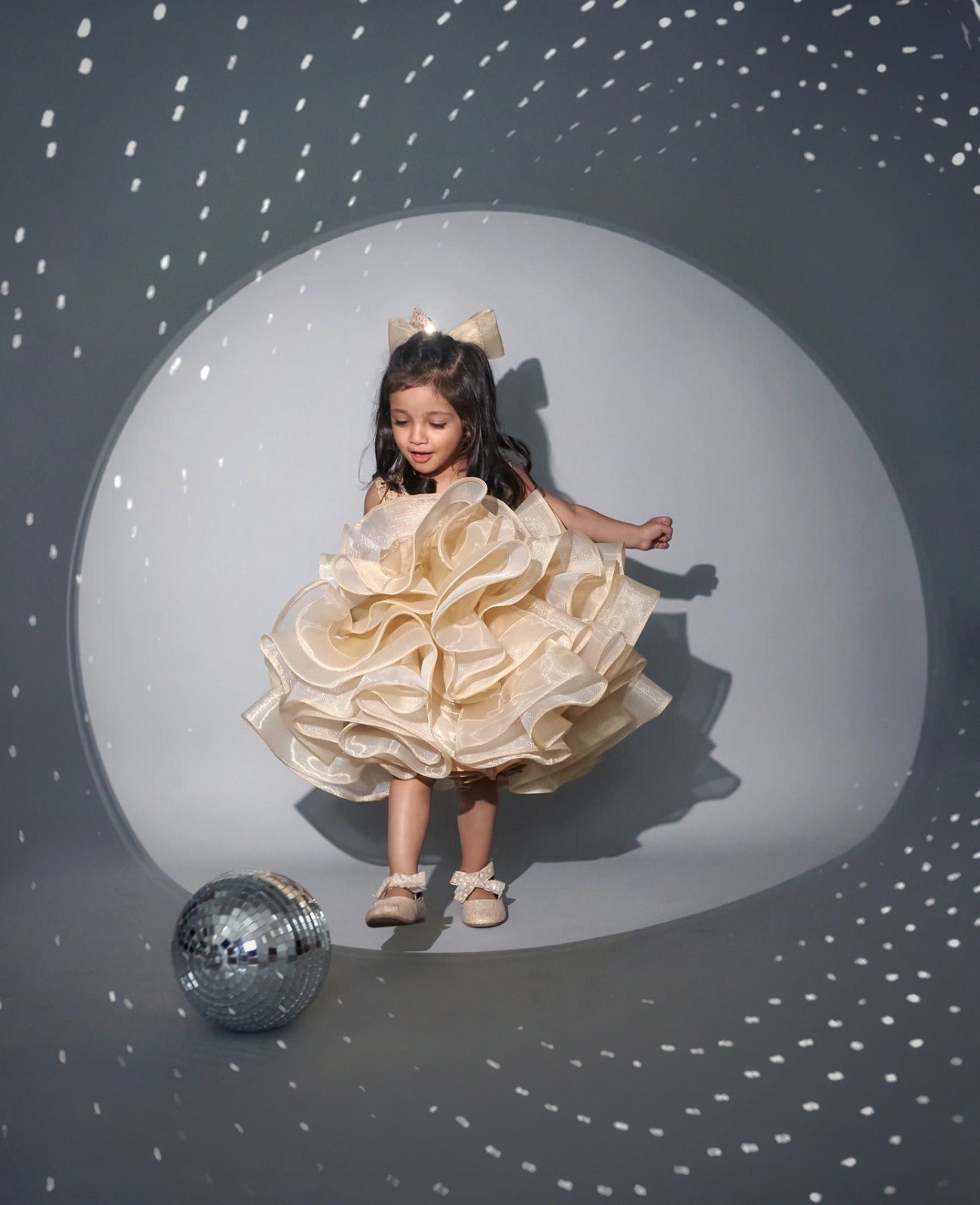 A twirl-worthy stunner, this radiant gold dress combines elegance with youthful charm. Featuring an ornate pearl and sequin bodice and a voluminous organza skirt, it is perfect for celebrations and special occasions. The sleeveless cut and deep V neckline with a modesty patch strike a graceful balance of style and comfort.