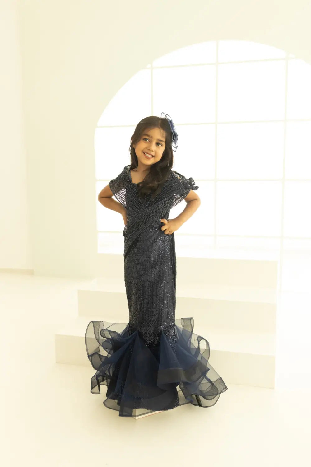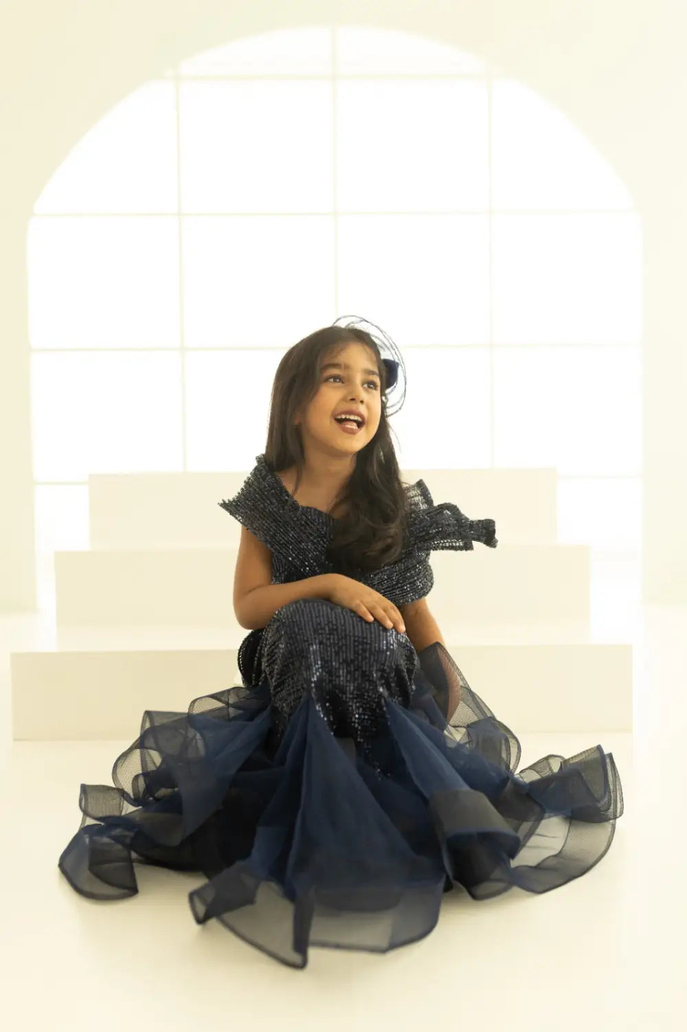 Make a splash with our Extravagant Mermaid Gown — where drama meets grace! This breathtaking gown features a heavily embellished bodice, structured ruffled hem, and floral petal detailing that adds volume and flair. Perfect for pageants, birthdays, and grand entrances. Made from luxury net and sequin fabric for a sculpted yet fluid look.