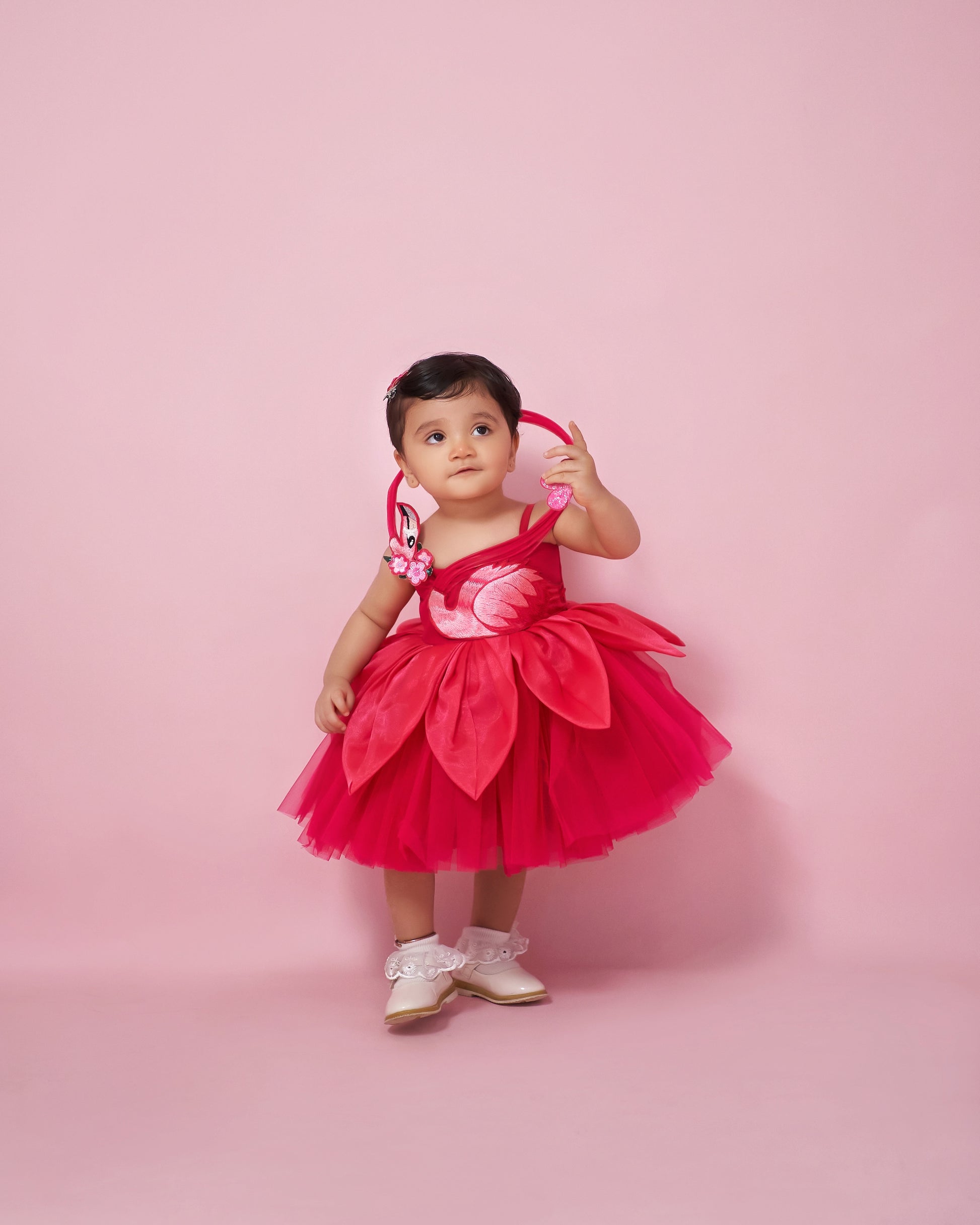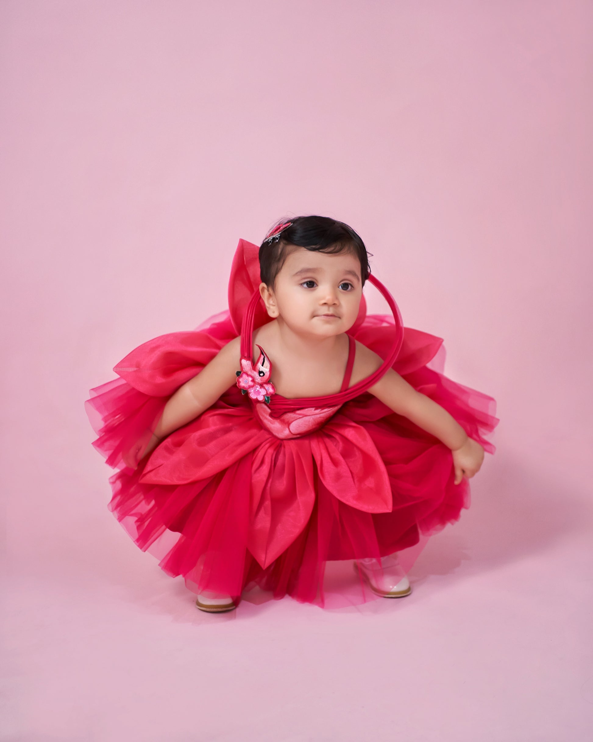 This exquisite dress features a hand-embroidered flamingo design embellished with sequins, creating a stunning flamingo effect. The skirt is designed to flow gracefully, accentuated by a wired neck detail for structure and elegance. Paired with a fan bow top, this ensemble combines artistry with sophistication, perfect for making a striking statement at any event.