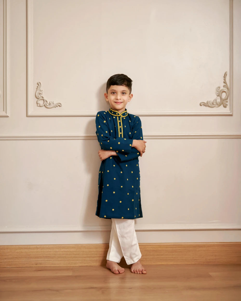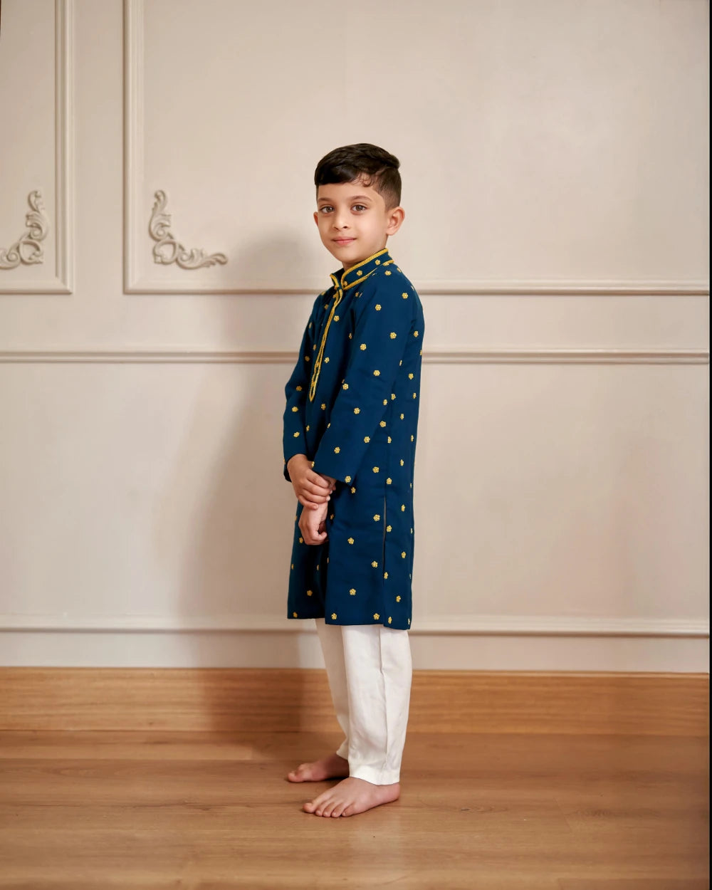 A navy blue kurta with subtle golden polka motifs, highlighted with golden piping on the placket and collar. Paired with classic white pajama pants for a regal and modern ethnic look.