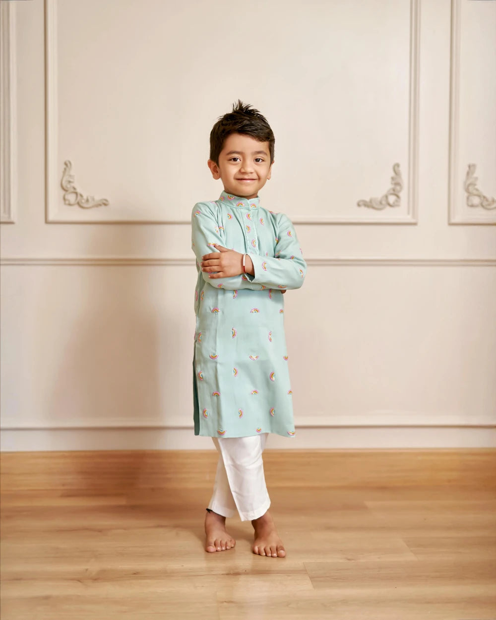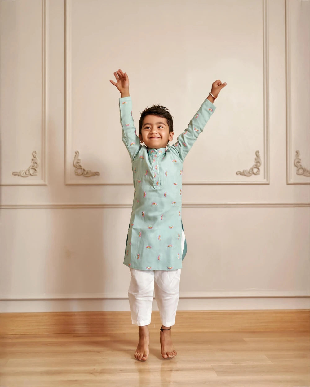 A mint green kurta with tiny floral motifs in pink and white, creating a refreshing summer ethnic look. Styled with white pajama pants for balance and charm.