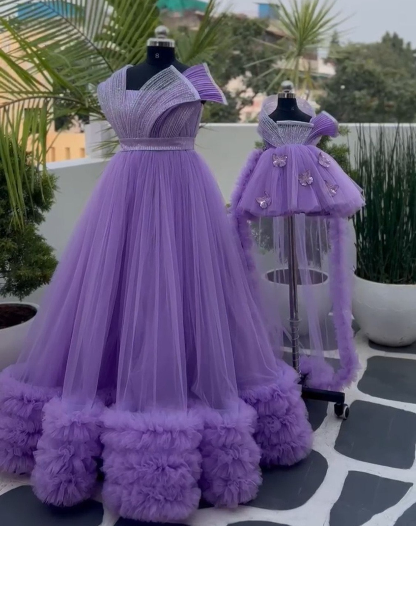 The Lily and Violet collection offers a distinctive pairing designed for mother and daughter. The mother's ensemble features a tall skirt with a heavy ruffle and a unique wrapped ring element, complemented by a delicate net overlay for added texture and elegance. The daughter's outfit includes a charming puff piece that adds volume and youthful flair. Please note, butterfly embellishments are available as an optional addition to enhance the overall look. This combination balances sophisticated detail with playful accents for coordinated style.