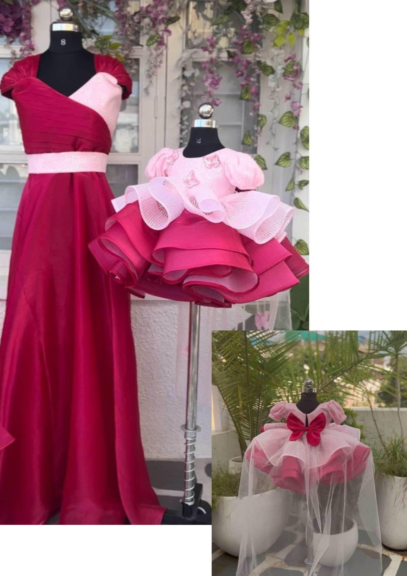 Celebrate special moments with the Mackenzie Duo, a sophisticated mother-daughter ensemble blending deep wine red and soft baby pink. The mother’s gown features an elegant floor-length design with a pleated criss-cross bodice and short puff sleeves, creating a defined waistline for a graceful silhouette. The daughter’s dress complements with playful layered ruffles, delicate embroidery, and a statement bow, crafted from shimmer net, organza, and satin-like fabrics that add volume and richness. Perfect for weddings, receptions, and photoshoots, this duo makes a striking, coordinated statement.