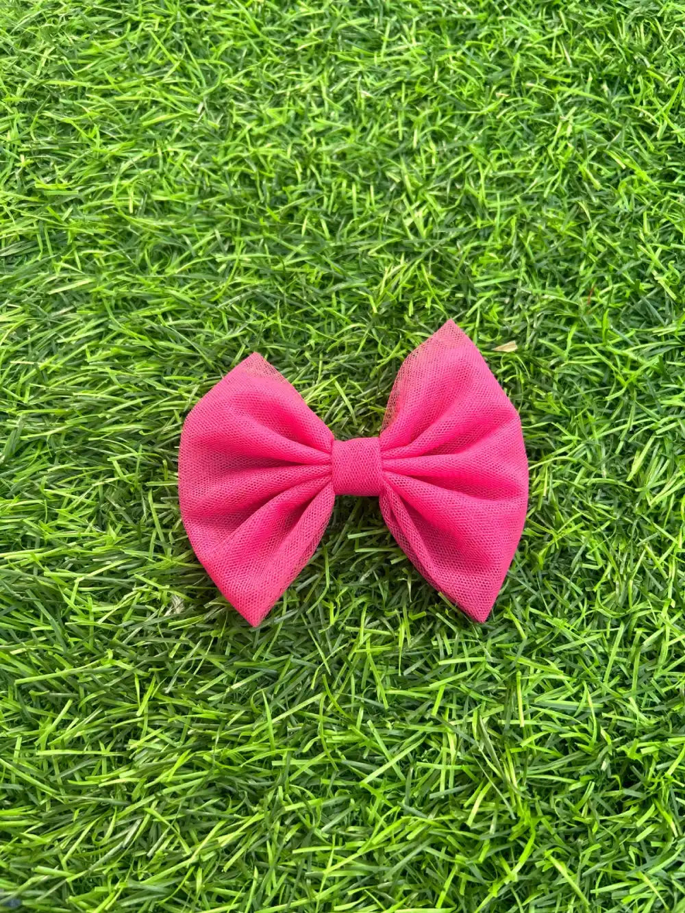 A bright pop of pink in a classic net bow — simple, sweet, and playful.