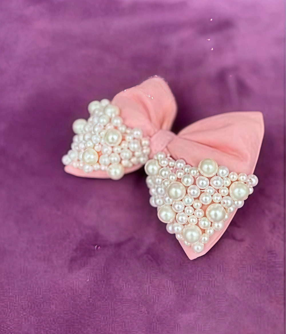 Turn heads with our luxurious Pearl Bow Clip, a true statement accessory for elegant occasions. Set on a soft blush pink base, this bow is intricately hand-embellished with clusters of lustrous faux pearls, giving it a rich and regal look. Whether styled with open hair or an updo, it adds a perfect touch of sophistication and charm.