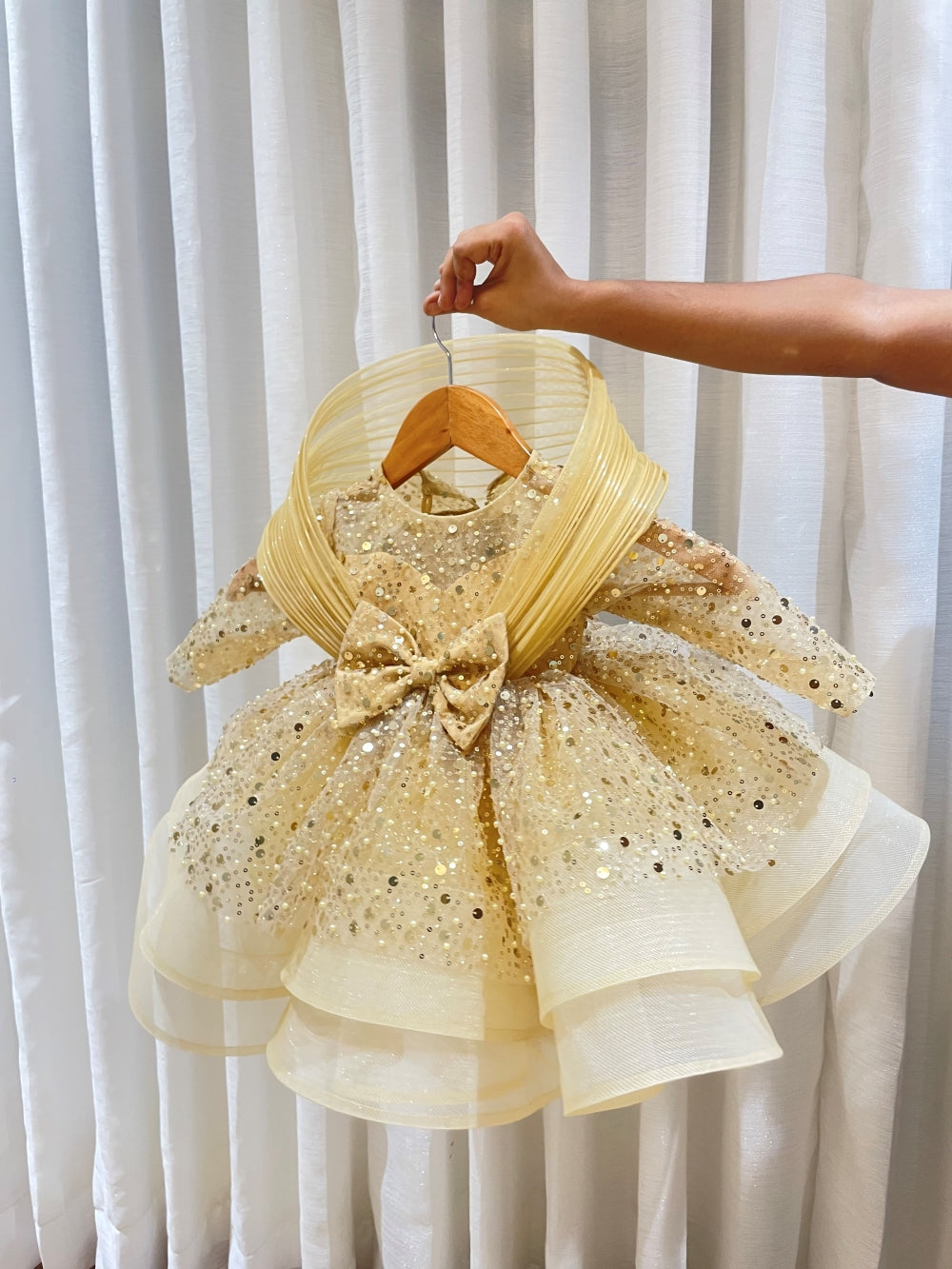 Make every celebration sparkle with the Golden Gala Dress, a dazzling blend of pearl-studded sequins and net that shimmers with every twirl. This knee-length stunner features a classic round neckline and elegant full sleeves, ideal for parties, weddings, and festive occasions.