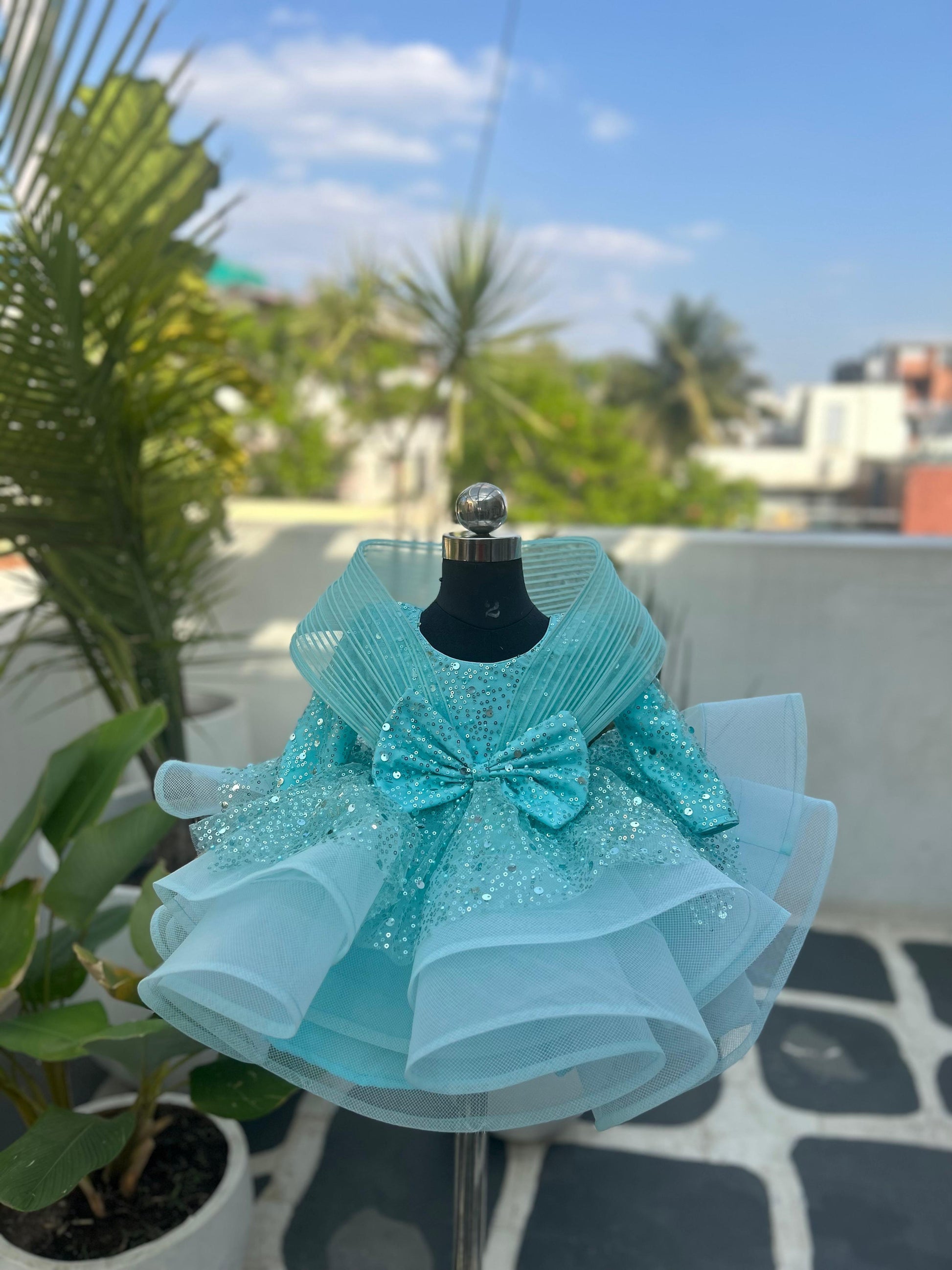 The dress is accentuated by a statement structured organza collar and a golden bow, adding a regal flair to its already enchanting silhouette. With a soft crepe lining, it ensures comfort along with style.