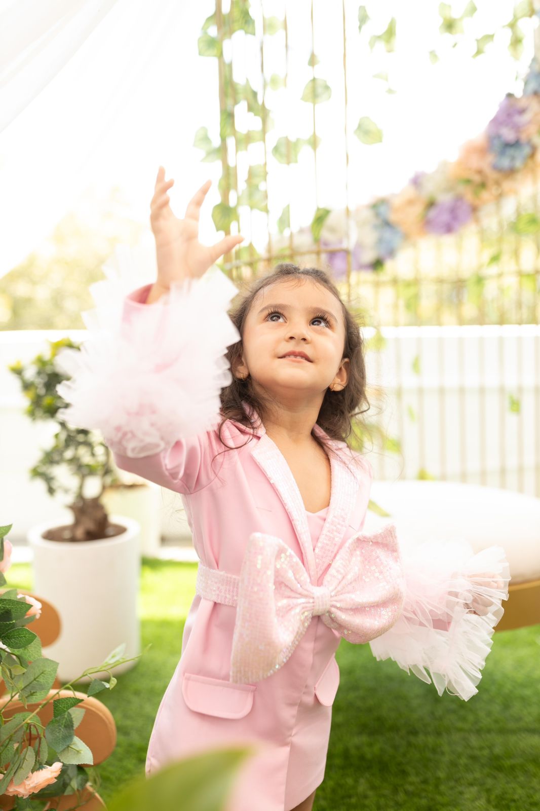 A charming mid-thigh length blazer dress for girls, crafted with soft pink blazer fabric and accented with sequins and net. The design features full sleeves with delicate ruffle detailing, an overlapping lapel neckline, and a unique heart-shaped cutout at the back. The dress is lined with smooth crepe for comfort. Perfect for stylish occasions.