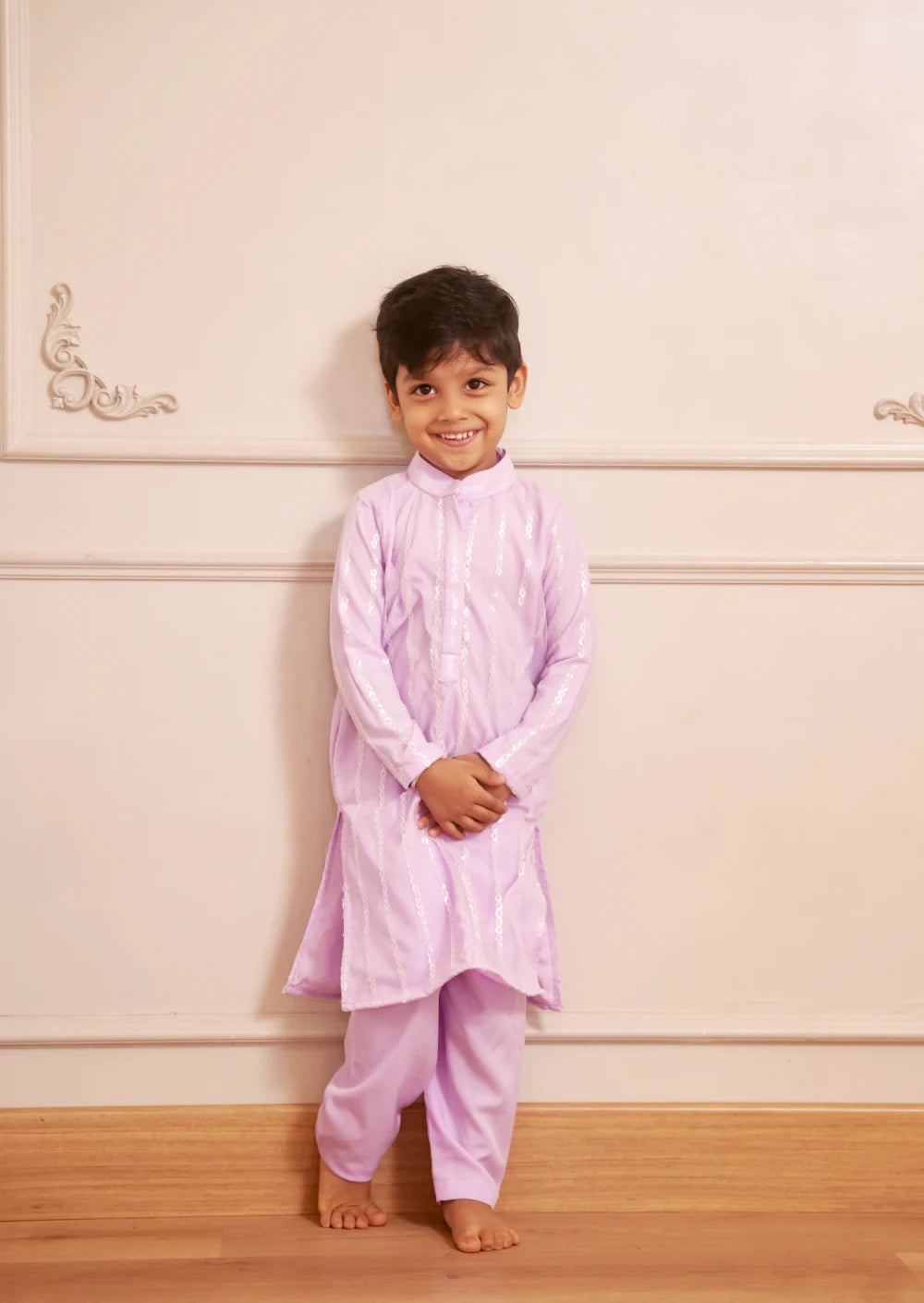 A stylish light lavender kurta made with soft fabric, featuring subtle shimmer patterns for a festive touch.