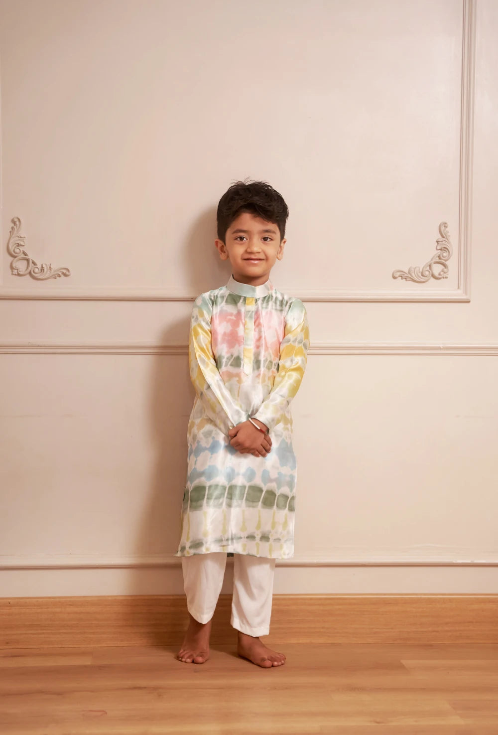Boy’s Outfit: Long pastel tie-dye kurta with white pants — light, breezy, and fun.
