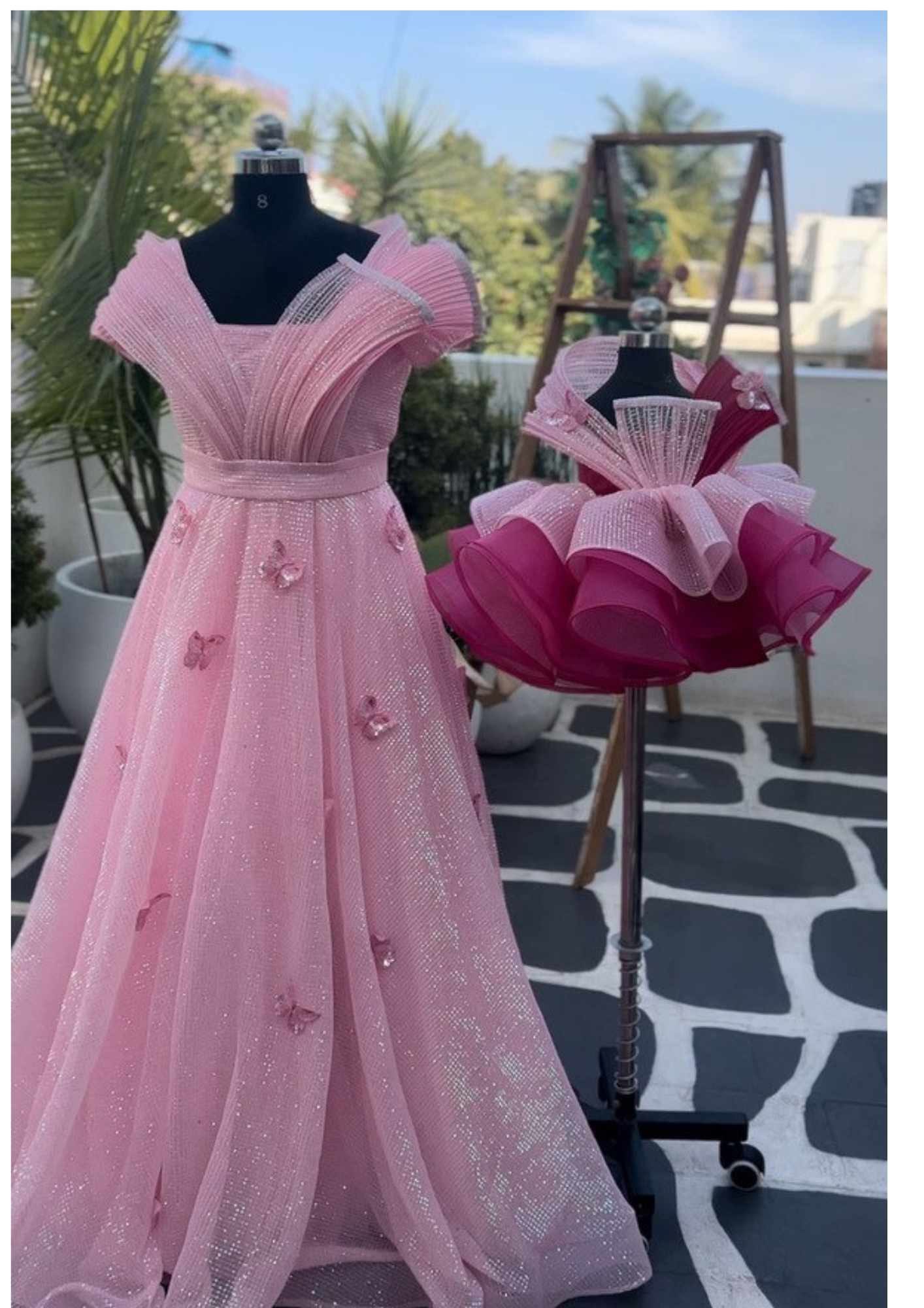 This dreamy mother-daughter matching gown set is designed to turn heads at any special occasion. The adult gown features a delicate butterfly appliqués adorning the flowy layered skirt. The kid's version is a modern princess-style frock with a voluminous flared silhouette, layered with sequins fabric and organza frills for dramatic flair. Ideal for birthday parties, maternity shoots, or twinning at weddings.