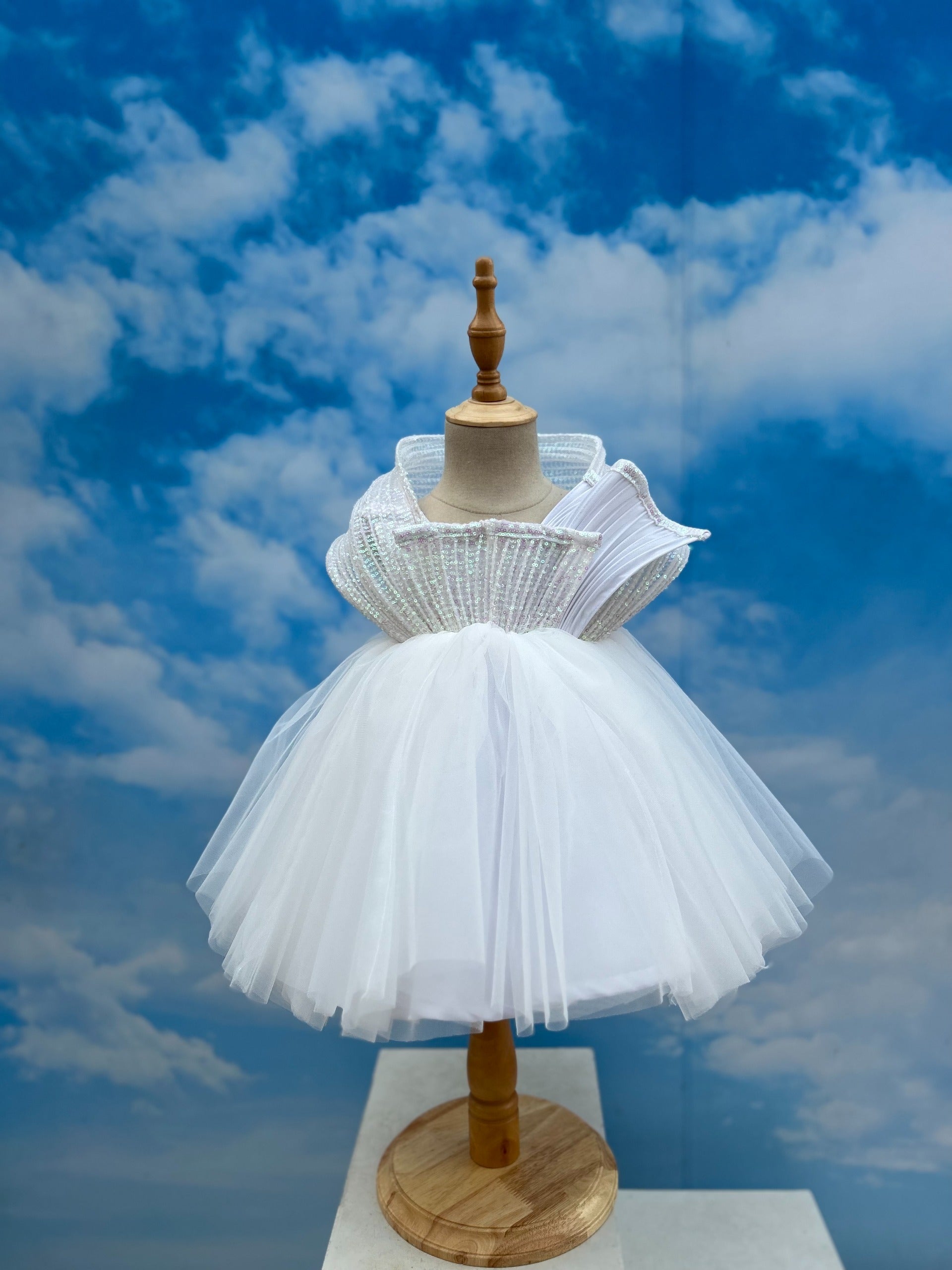 This enchanting white mini gown from the collection exudes a fairytale charm with its distinctive silhouette and elegant craftsmanship. Made with premium net fabric adorned with sequin detailing, it features a voluminous short front skirt that’s playfully layered and a dramatic long net train at the back for a stunning effect.