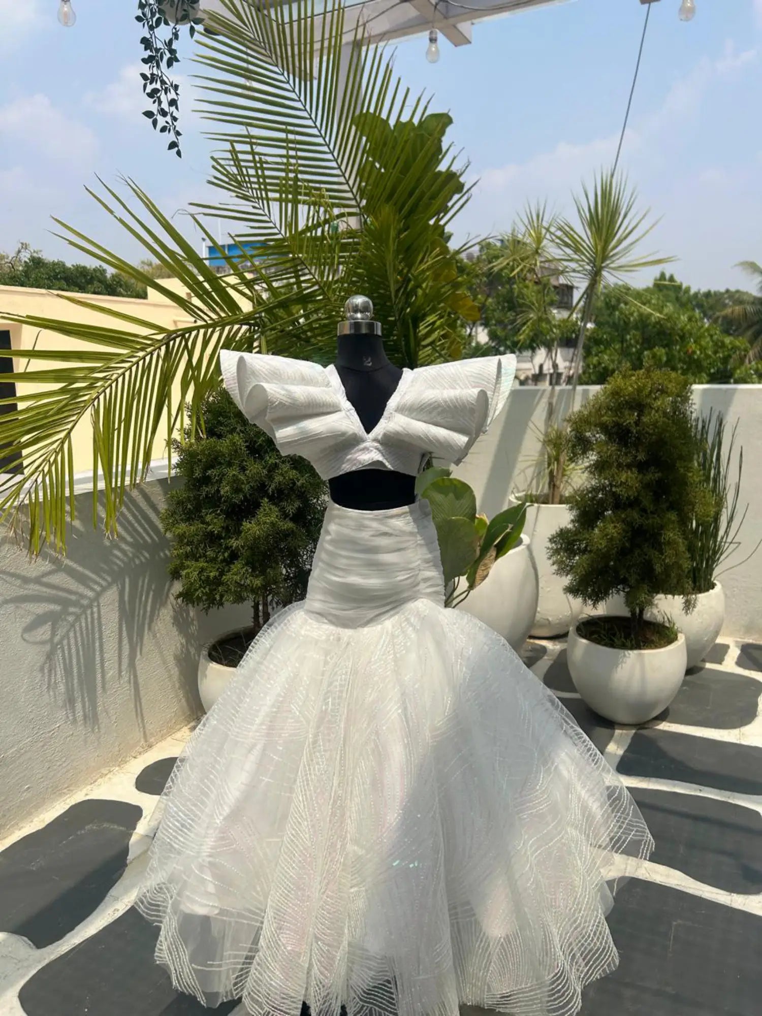 An elegant all-white piece with a statement ruffled top featuring dramatic layered sleeves. The fit-and-flare skirt cascades into a mermaid-like structure, finished in shimmering netting with linear textures. The whole look has a glistening icy feel—graceful yet bold for a couture moment. Perfect for wedding and evening occasions.