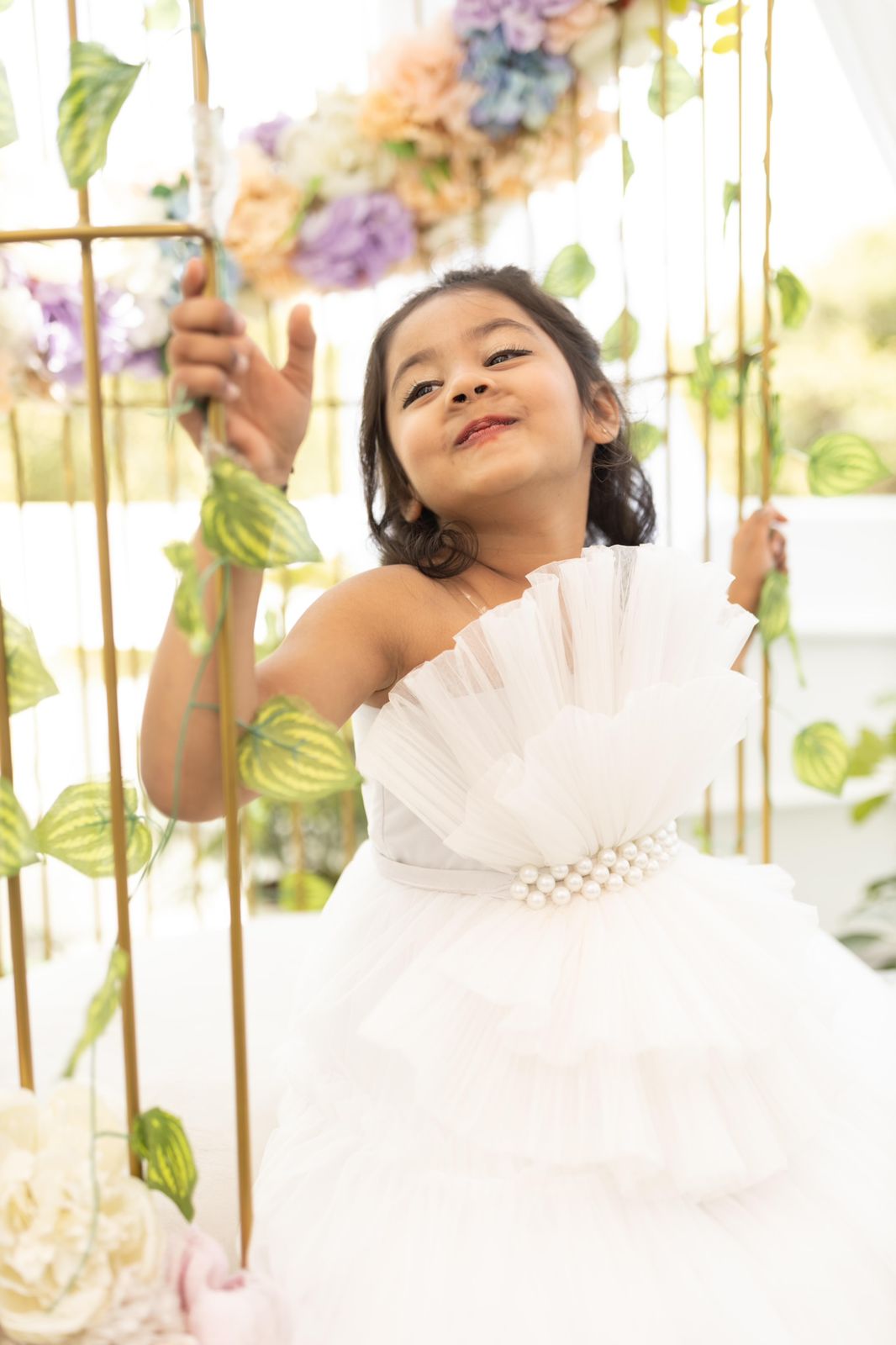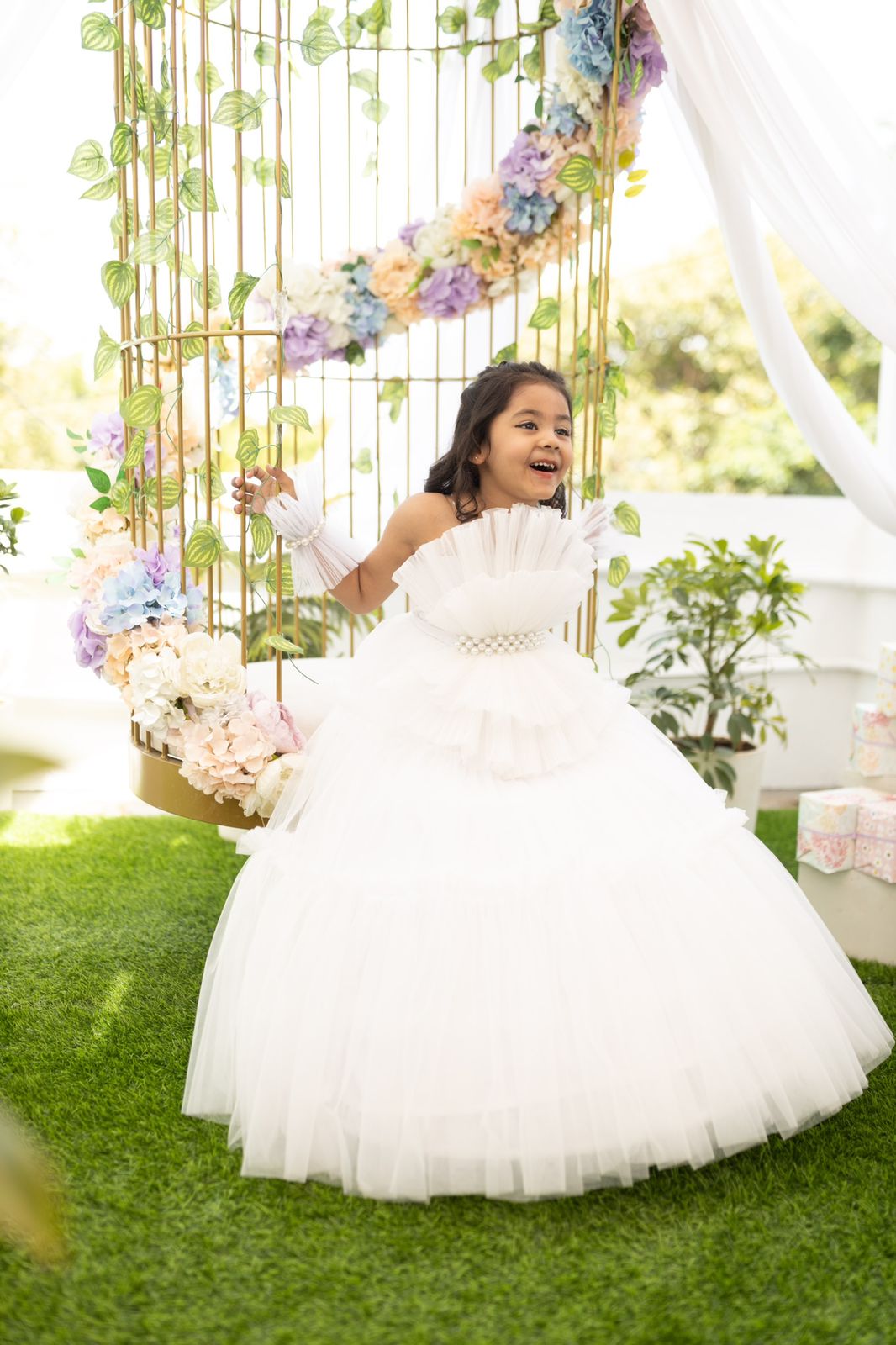 A dreamy white ball gown designed to make any little girl feel like a princess. Crafted from soft net fabric with a crepe lining, this dress features a layered pleated bodice with a pearl-embellished waistband for a touch of sophistication. Transparent shoulder straps and a detachable drape add elegance and comfort. The full-length skirt includes a ball ring for dramatic volume—perfect for grand occasions.